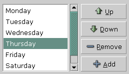 Some properties, like the buttons of a dialog, contain a list of strings. To insert a new item after the currently selected string, click on the Add button, then type in the new string. To modify an existing item, select it from the list and in the new string. The Up and Down buttons change the position of the currently selected item.